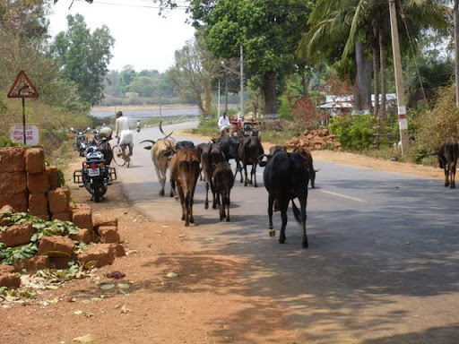 Quanto mais subimos para Norte, mais animais na estrada. No estado do Karnataca, o desafio do trânsito de motos, rickshaws, camiões e autocarros é potenciado pelas pachorrentas vacas e pelos assustados búfalos. As povoações são um labirinto que se atravessa com dificuldade.